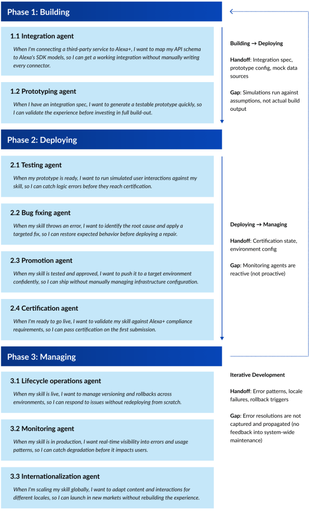 - Agent Relay: “I have an agent. I want Alexa+ to hand off to it.” The developer defines scope boundaries (hand-off and hand-back conditions). The agent infers scope boundaries as a starting point. The developer must approve or negotiate direction before proceeding.