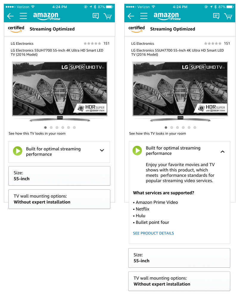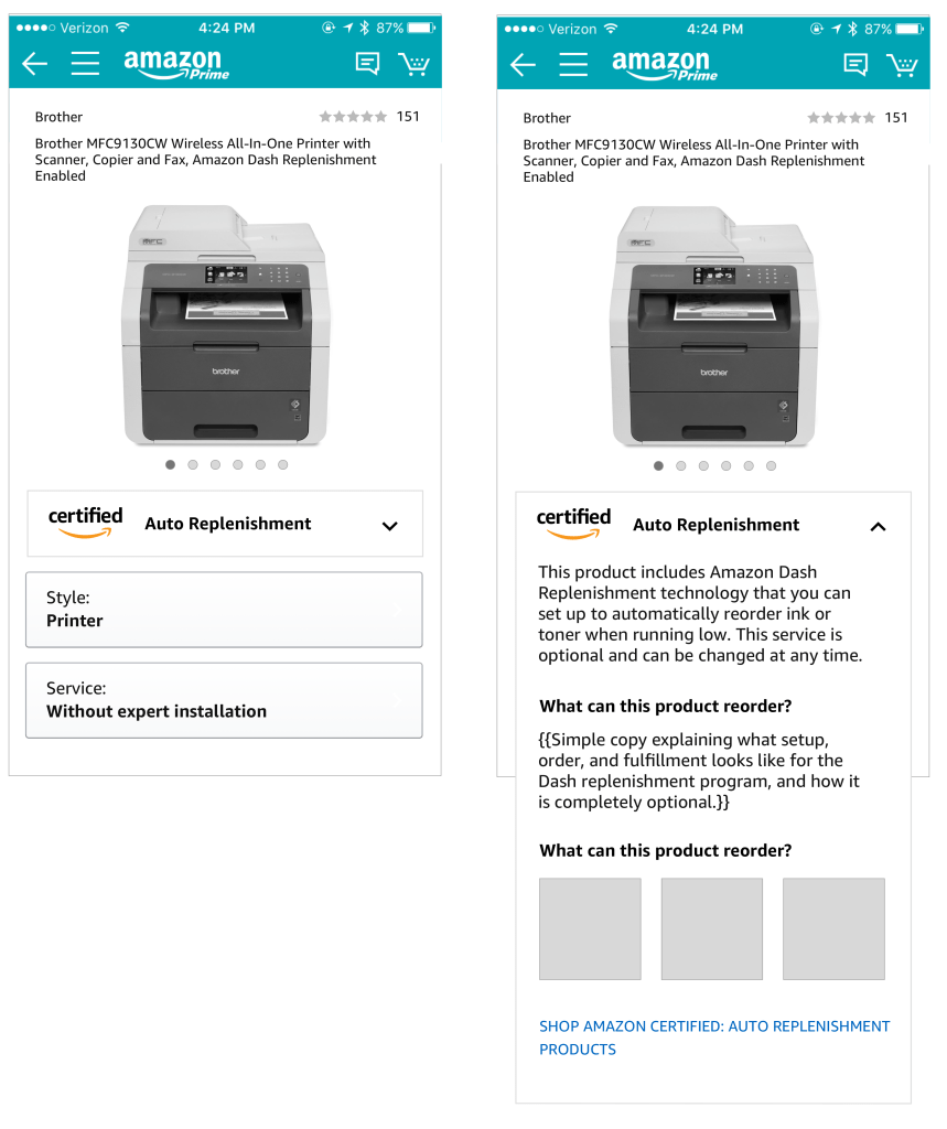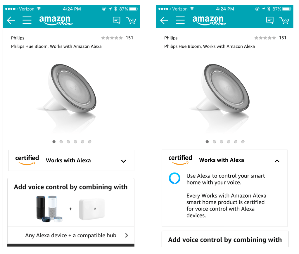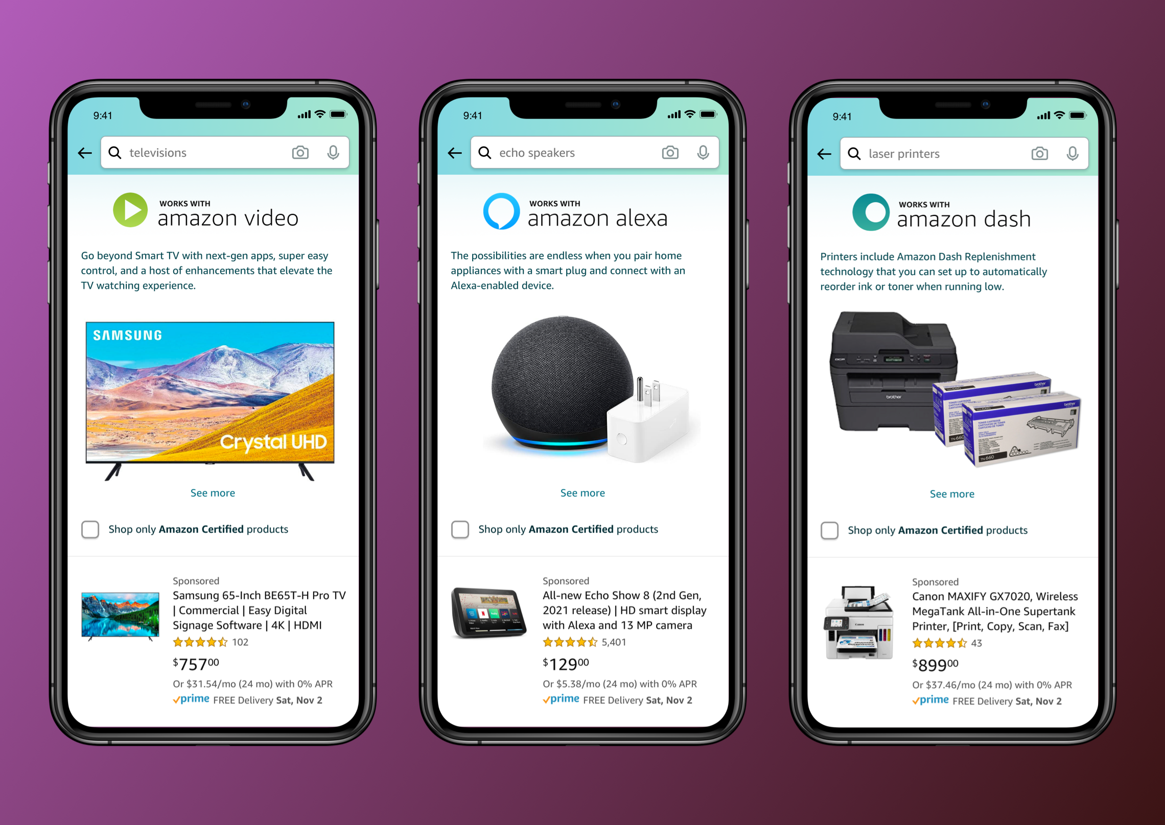 We focused on designing clear, intuitive ways for customers to identify Amazon Certified products and understand their compatibility. In search, we extended familiar visual callouts to highlight certified product attributes. On product detail pages, we introduced just-in-time educational content that explained how and why a product worked with Amazon services. This dual approach allowed us to reduce customer confusion and build trust, while effectively showcasing how a physical product was enhanced through integration with a digital service.