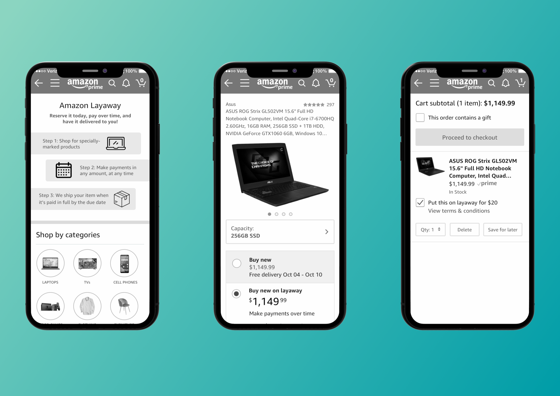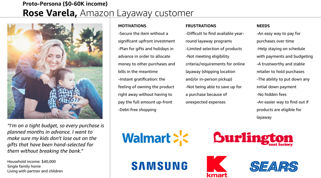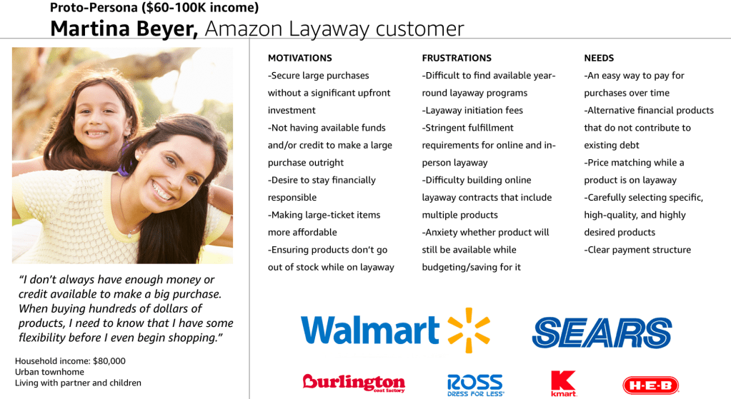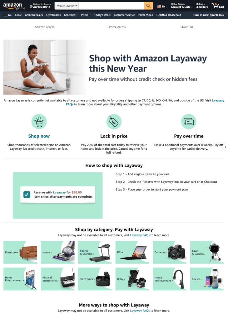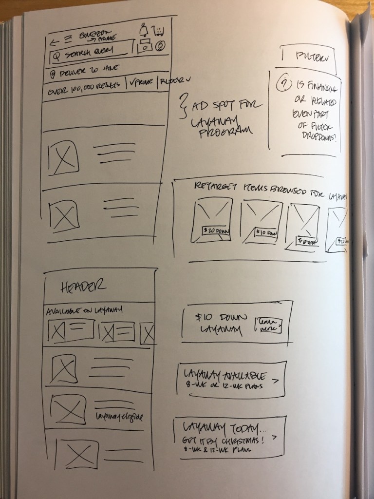 I explored an early-stage layaway experience to initially launch for consumer electronics products. Amazon Layaway publicly launched in 2022 through an internal engineering and PM partnership.