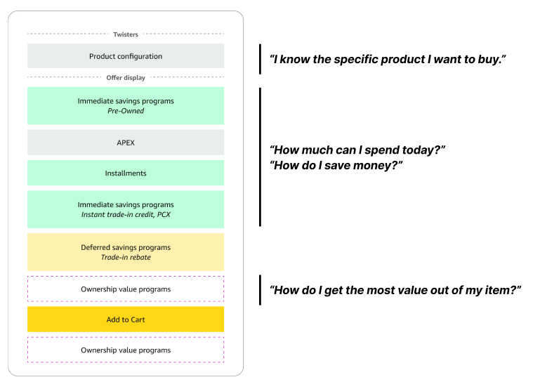 I designed a unifying Buy Box framework grounded in customer mental models rather than internal program ownership. The framework organizes the experience around four core questions customers naturally ask: I know what I want, How much can I spend today?, How do I save money?, and How do I get the most value over time?