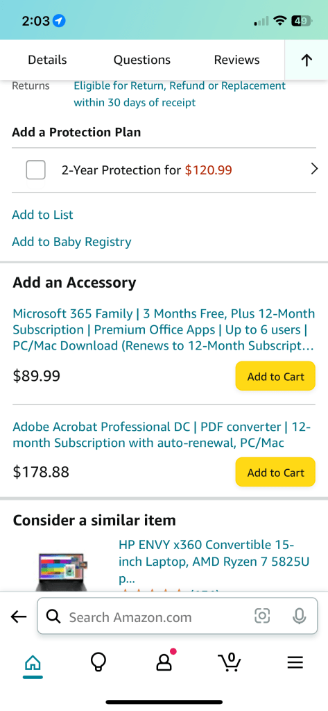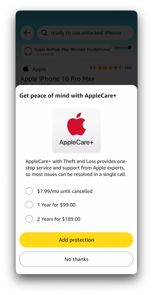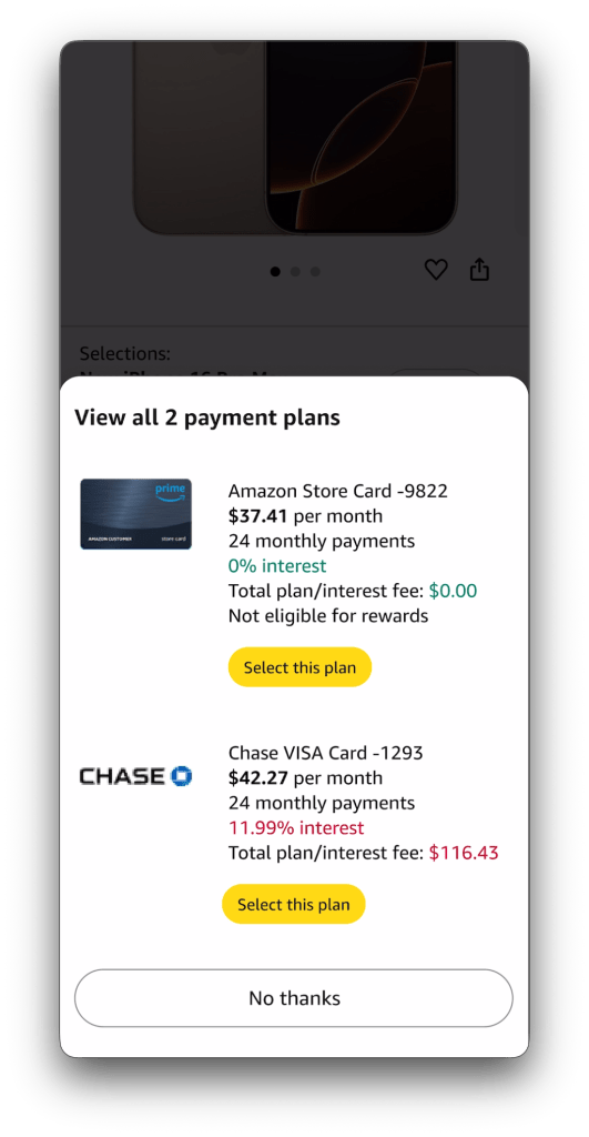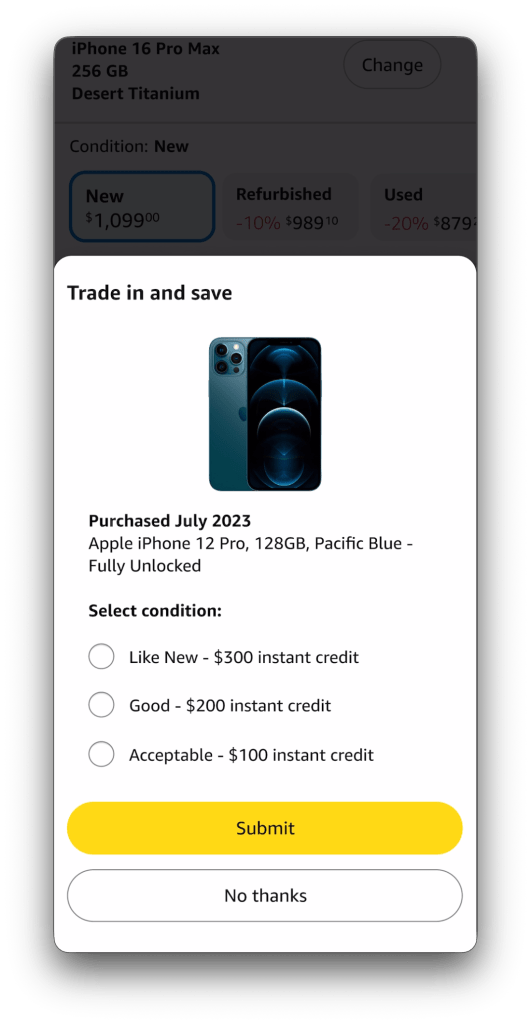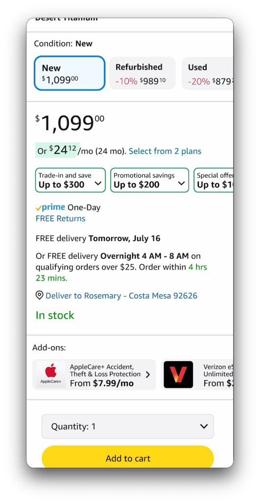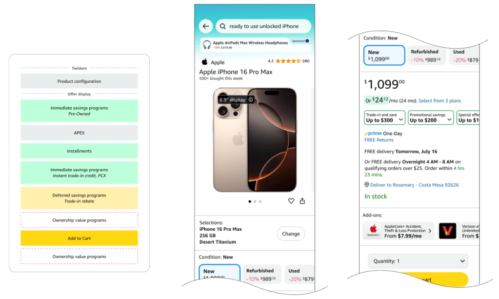 High-consideration purchases on Amazon often create anxiety around affordability. While customers increasingly evaluate total value—not just base price—the Buy Box experience exposes internal feature complexity rather than supporting how customers make decisions. Cost-reducing options like trade-ins, installments, promotions, and warranties are fragmented and inconsistently ordered, forcing customers to reconcile information at the moment of purchase.