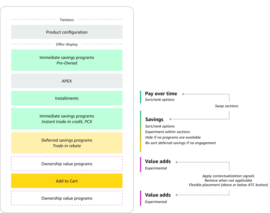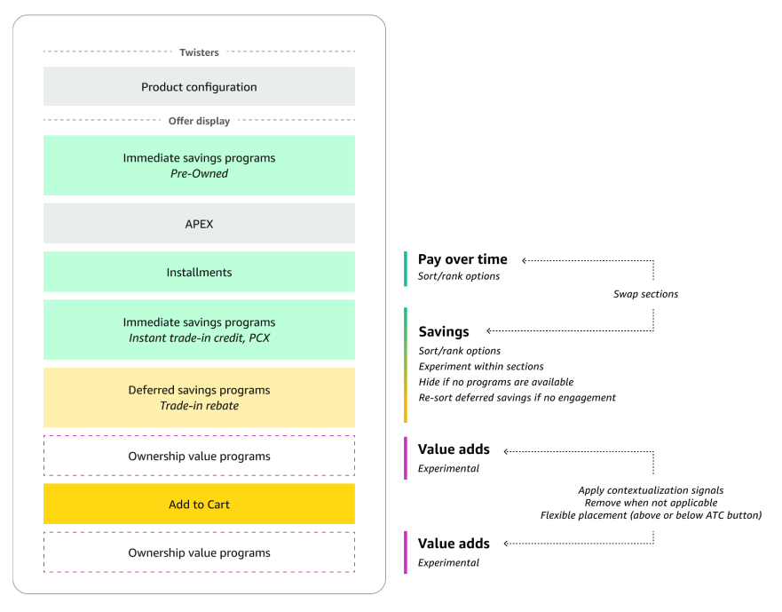 Instead of prescribing a fixed layout, the framework defines macro decision groups—payments, savings, and value adds—with rules for sequencing, prioritization, and suppression. This allowed the experience to flex by product type, acknowledging that expectations differ across categories (for example, trade-ins for wireless versus other high-ASP products).