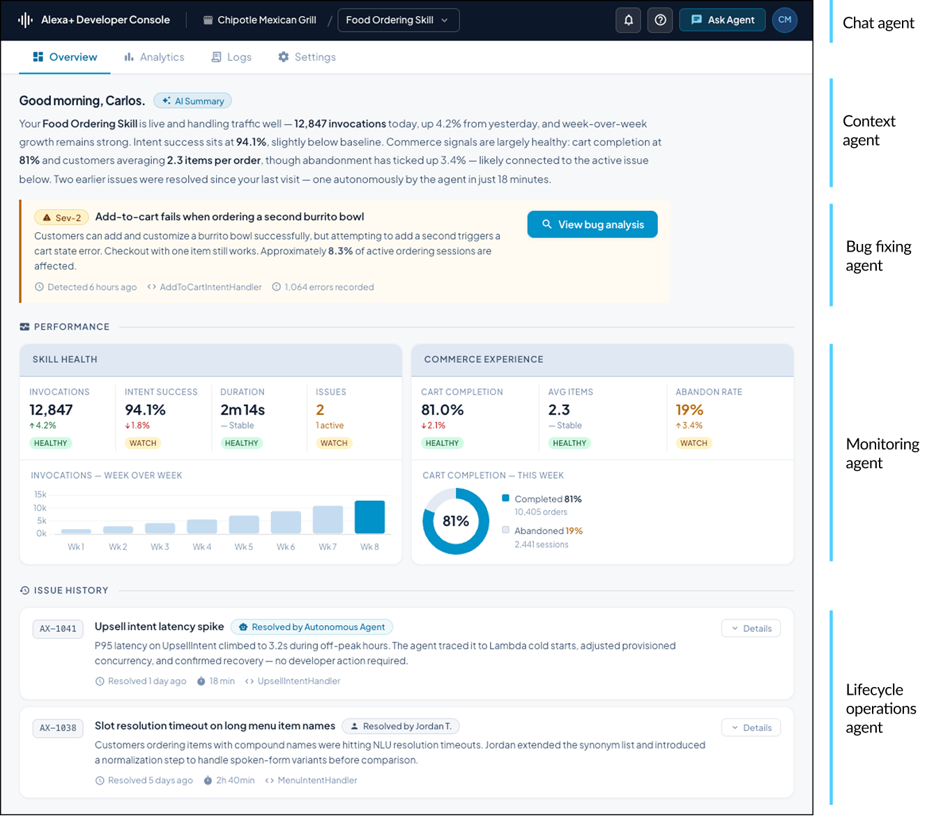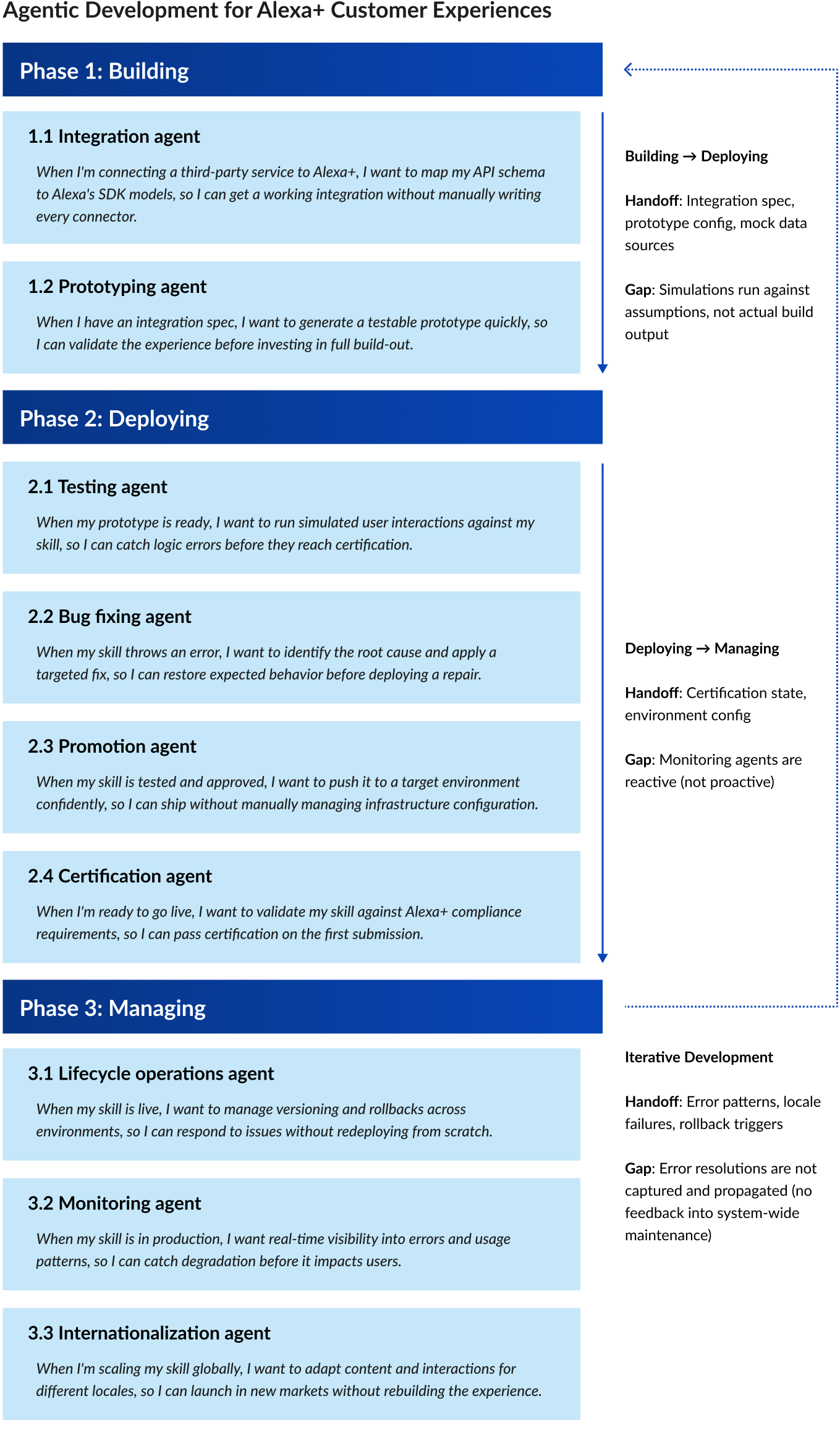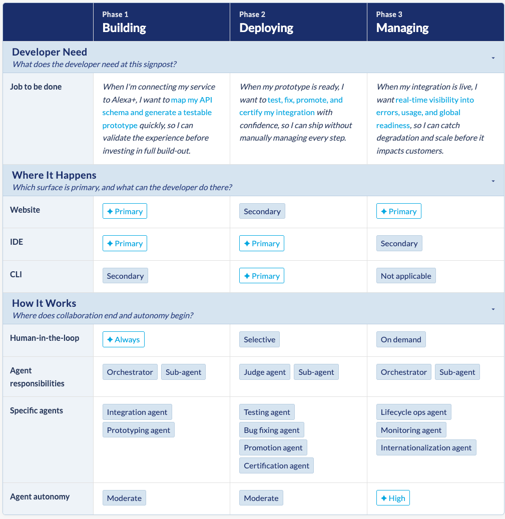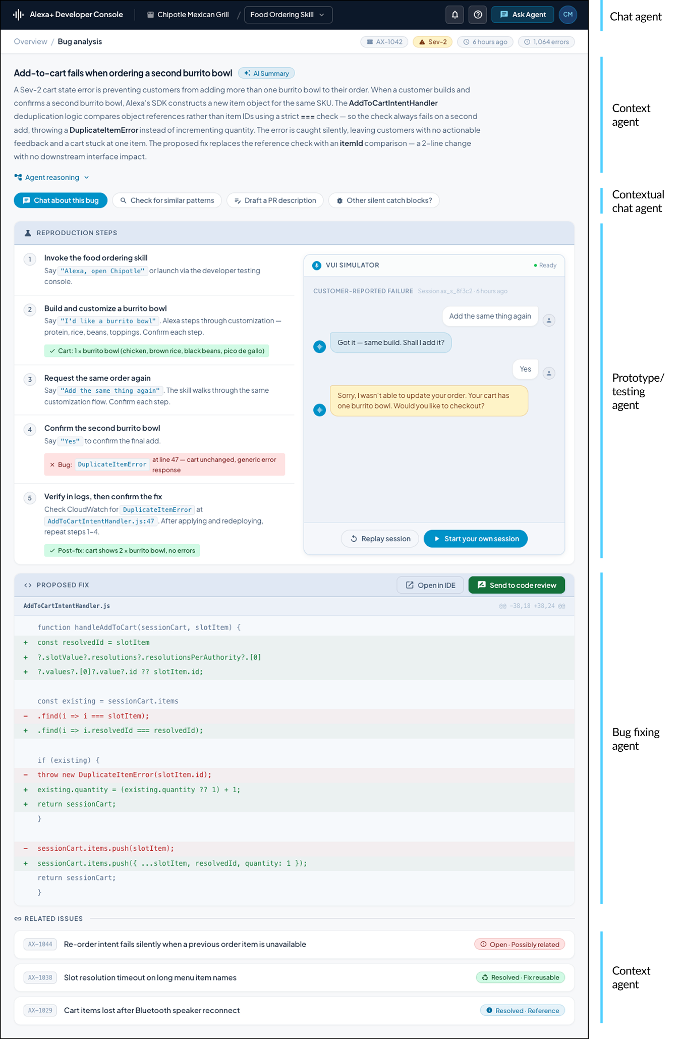 When Alexa+ began scaling its agentic platform, the underlying investment was substantial: multiple specialized sub-agents handling integration, debugging, documentation, and code validation. But from a developer’s perspective, none of it felt like a system. Each agent had its own surface, its own interaction model, its own context. A PM investigating a production bug handed off to an engineer who had to rebuild understanding from scratch in a completely different tool. The problem main problem was a lack of coherence across automation functionality.